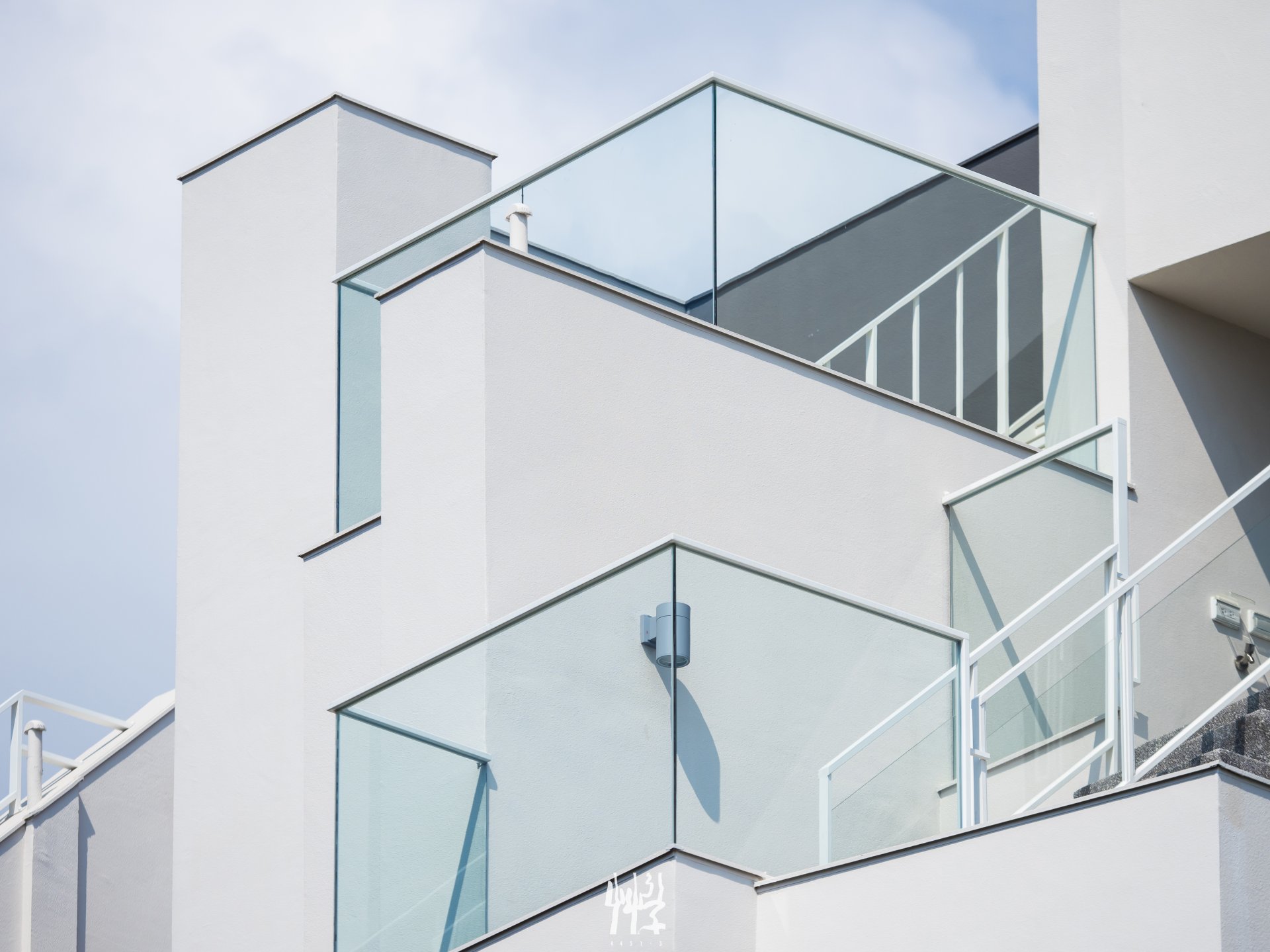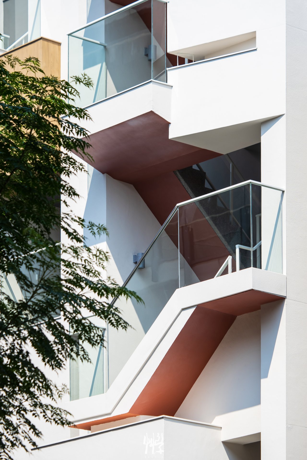一般透天建築設計中較為隱蔽的垂直動線被設計配置於建築物外側,延伸室內起居空間的同時也轉化為建築內外的區域分界;雖然樓梯立面公開可見,但正因其位置與型態,使鄰近鐵道的住宅內部空間得以保有隱私,並在室外形成立面的造型語彙。而樓梯本身所具備的型態、方向及行進的視線移轉,則與其所面對的綠帶、火車站體、半開放月台與高架鐵路,對映出與使用關係相應緊密變化的多層次空間結果。 在街廓中,S戶鮮明的標誌性,是我們擁抱並利用這樣的基地條件,搭配以相應的設計策略,將可能的抗性轉變而成的建築獨特性;與社區的整體立面共同構築在街廓中的場域辨識度。