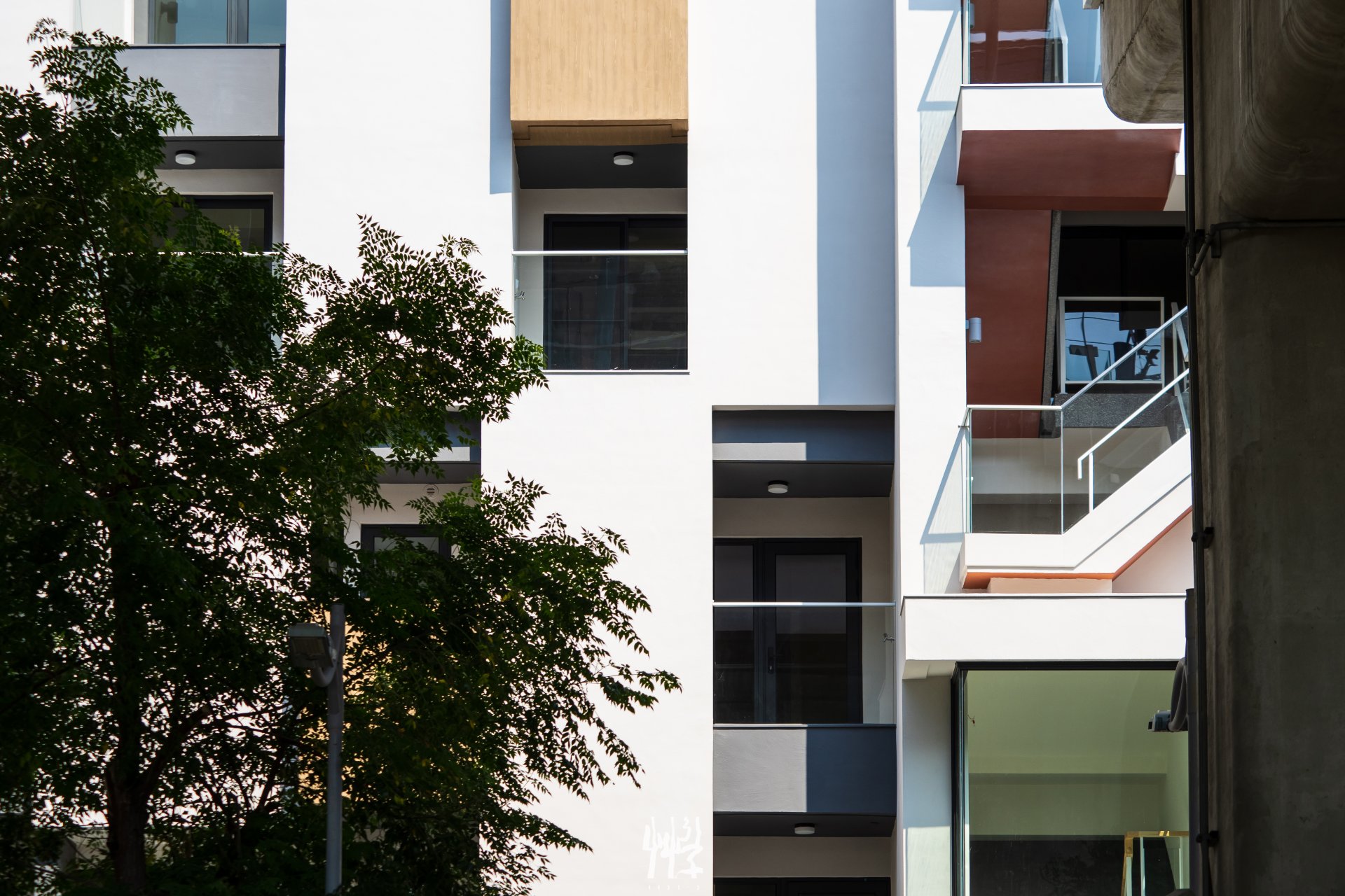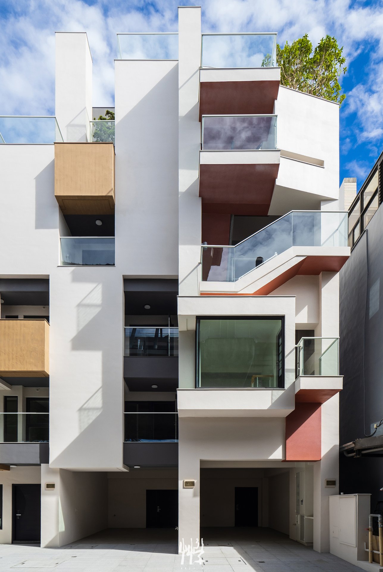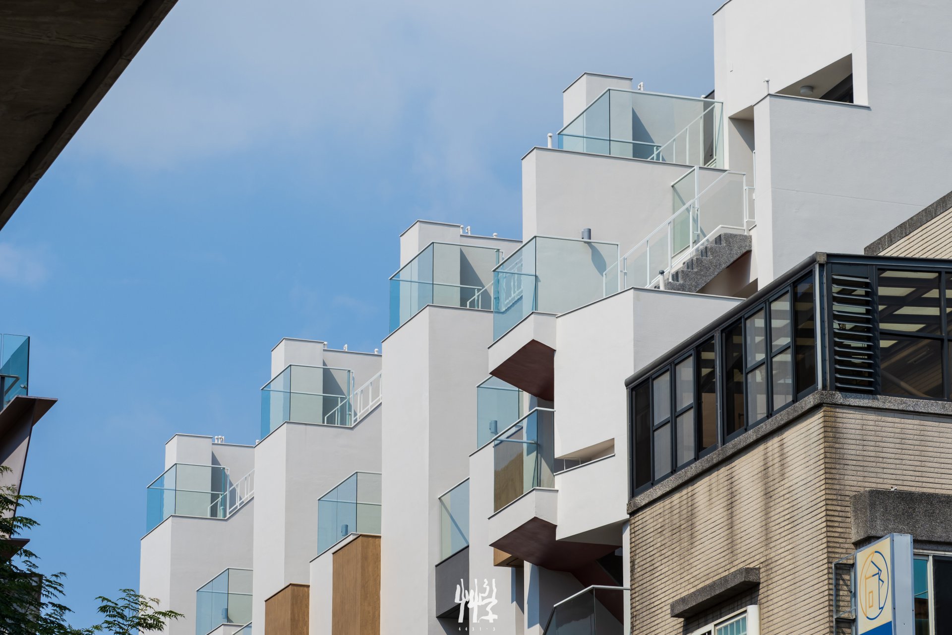 面對緊鄰高架鐵路與巷道的環境 ,設計複層立面,使其具備視覺緩衝與噪音隔絕的功能 ;白色外殼與深色內裡保持一定深度,形成具有空間感的立面量體,能有效減緩列車經過時的噪音與視線。 白色立面以起伏線條的律動,「映」對火車快速經過時的頻率;不同棟別與樓層的陽台、花台木紋量體錯落布置,塑造各居室不同的半戶外窗景。此外,日夜光影的變化使立面上的材質與深度具有不同的時間表情。 居住者在傍晚能靠在陽台邊,靜靜觀察列車進出月台 — 親近且保有距離;旅客在月台等待時,能看見建築透過量體線條,收納各戶日常的生活片段。