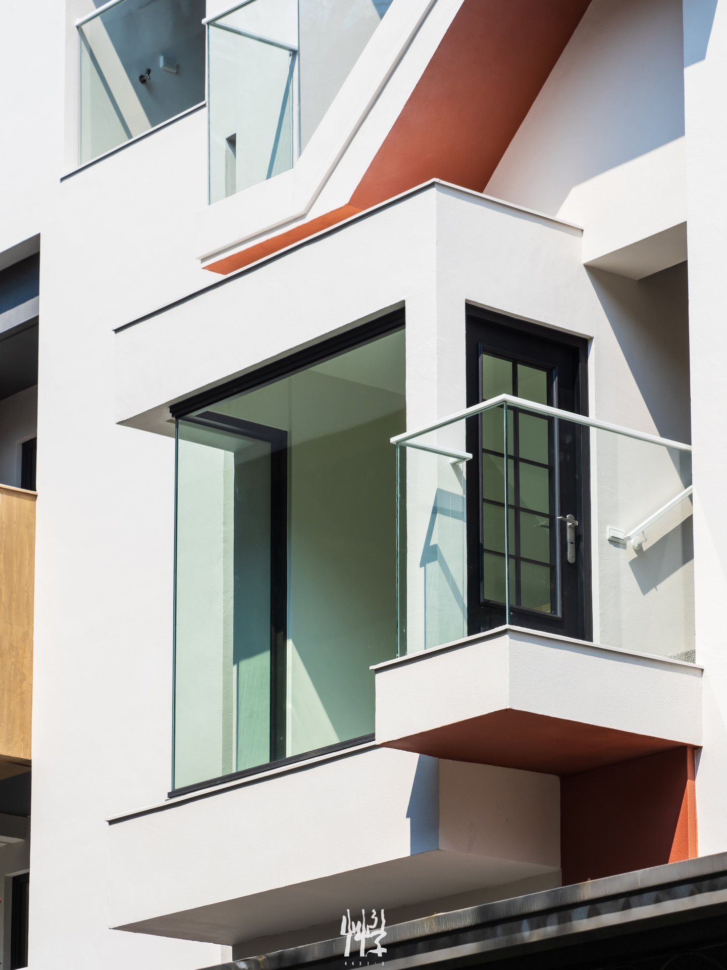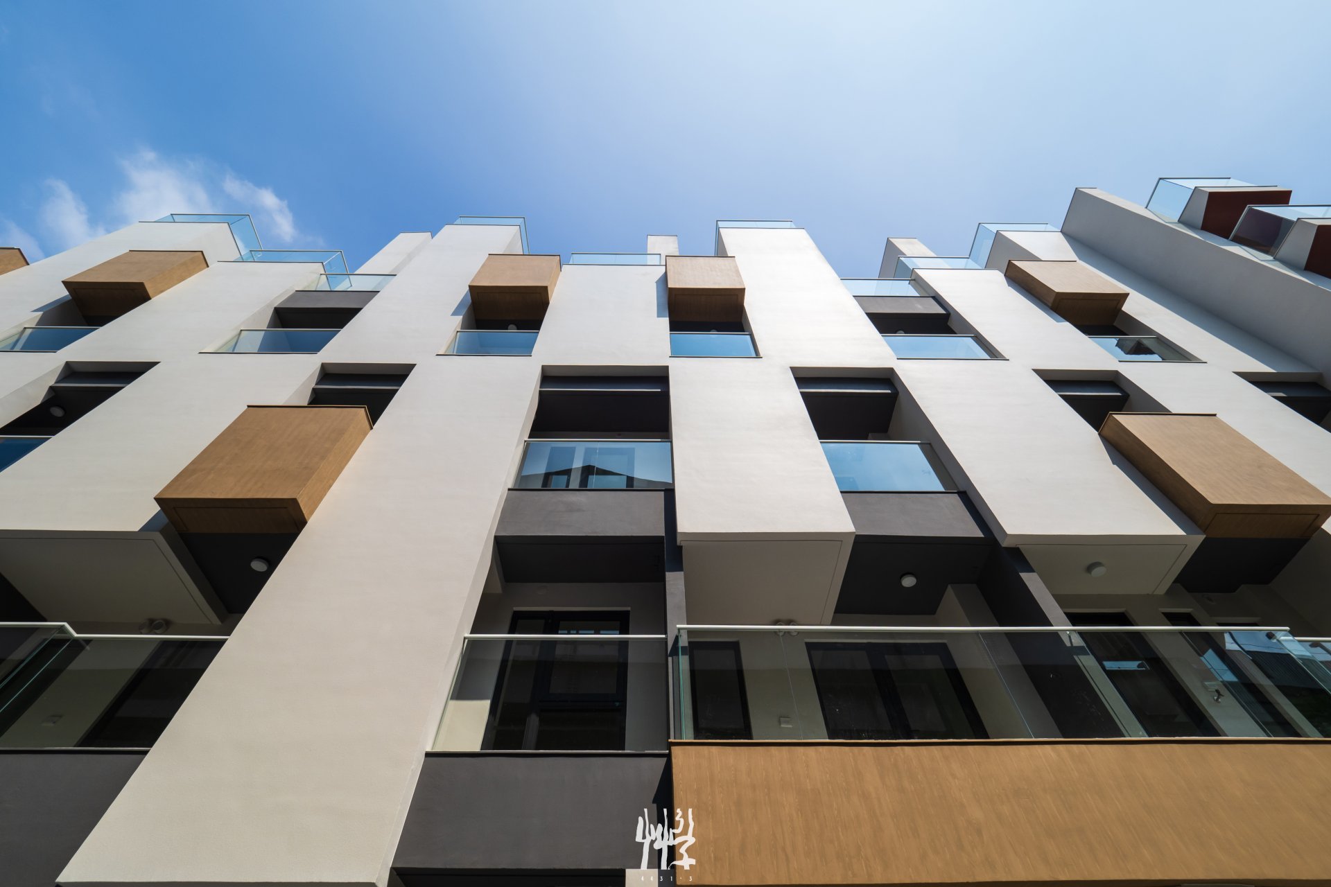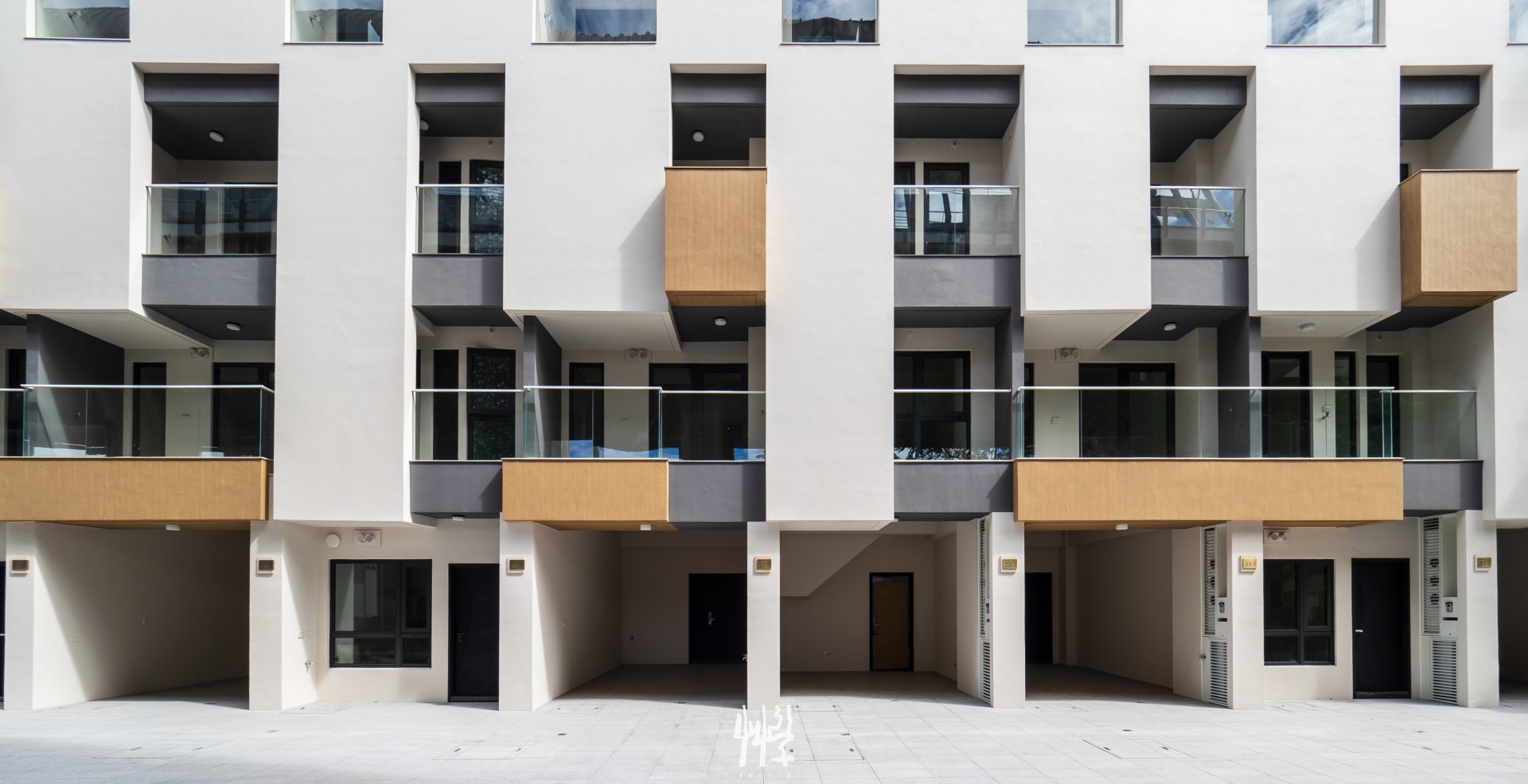 面對緊鄰高架鐵路與巷道的環境 ,設計複層立面,使其具備視覺緩衝與噪音隔絕的功能 ;白色外殼與深色內裡保持一定深度,形成具有空間感的立面量體,能有效減緩列車經過時的噪音與視線。 白色立面以起伏線條的律動,「映」對火車快速經過時的頻率;不同棟別與樓層的陽台、花台木紋量體錯落布置,塑造各居室不同的半戶外窗景。此外,日夜光影的變化使立面上的材質與深度具有不同的時間表情。 居住者在傍晚能靠在陽台邊,靜靜觀察列車進出月台 — 親近且保有距離;旅客在月台等待時,能看見建築透過量體線條,收納各戶日常的生活片段。