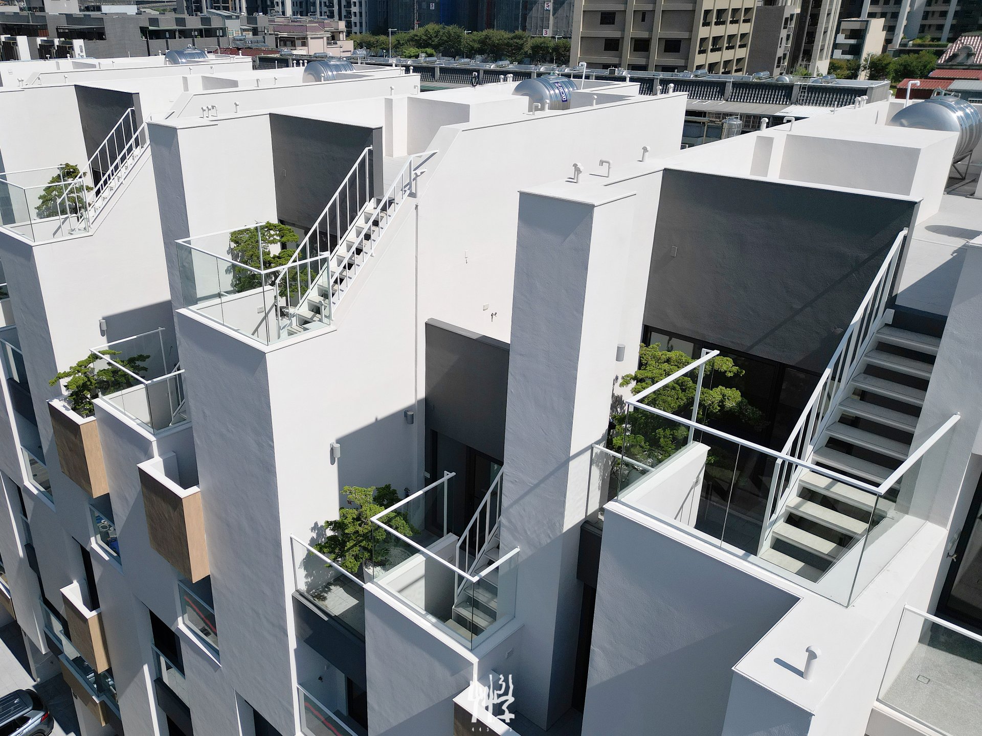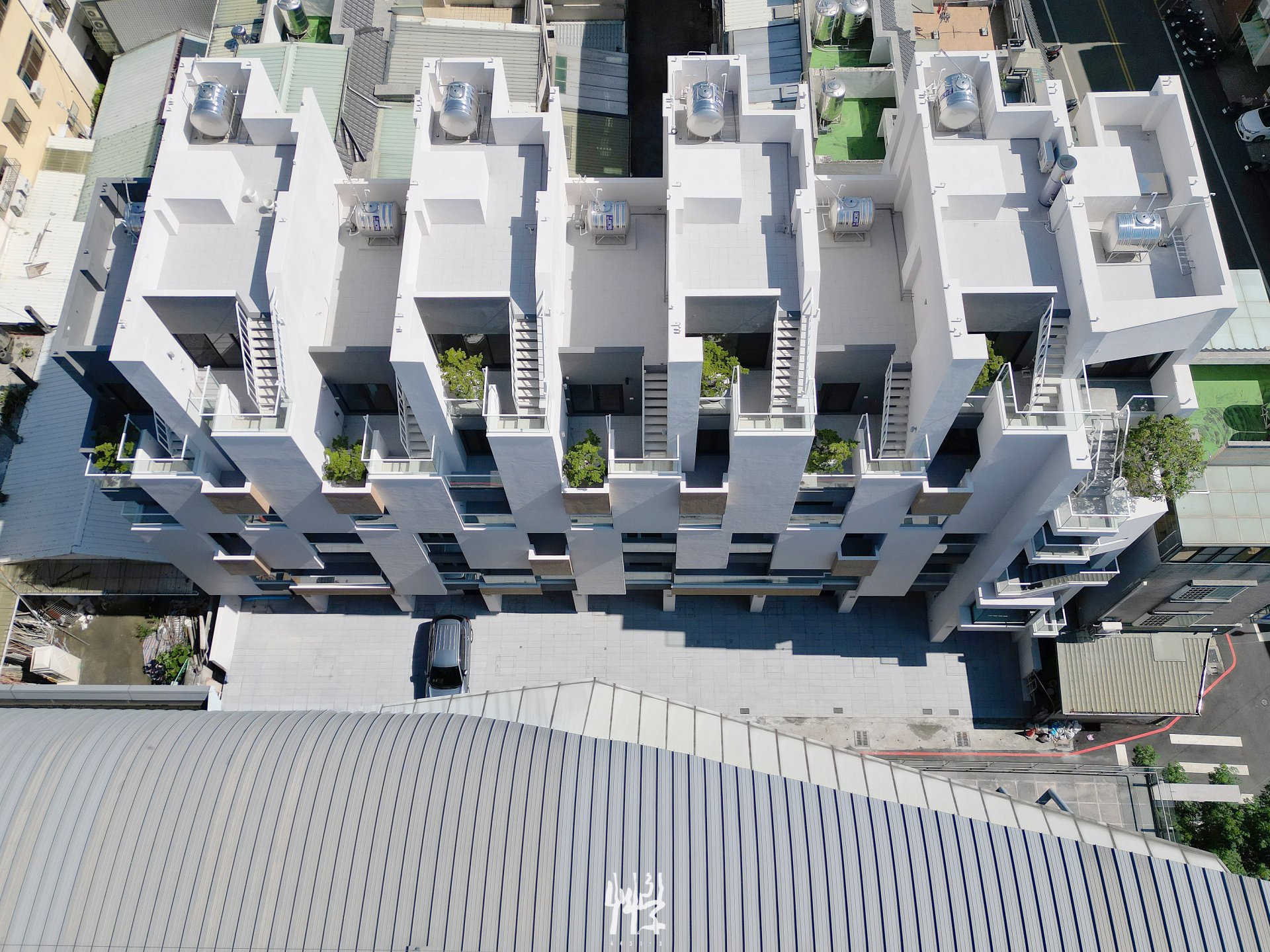透過量體交織、樓高互補以及各戶屋頂平台的差異化設計,充分發揮多種戶型連棟透天特有的量體設計條件;這樣的配置組合讓每一戶都擁有其獨特的價值,並且在面臨車站與鐵道的基地條件下呈現別出心裁的居住空間。