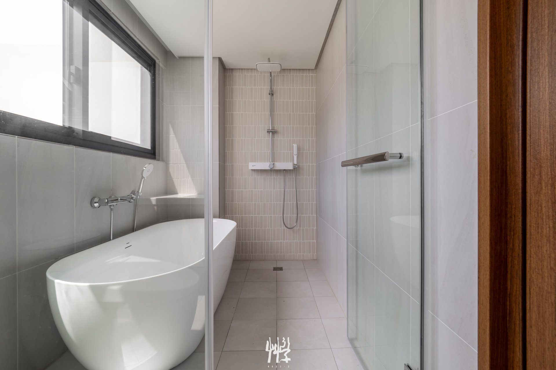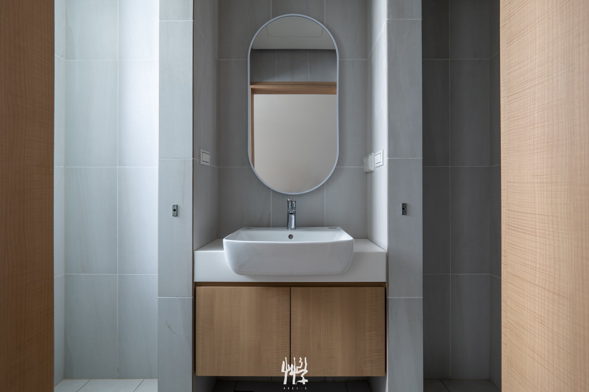 B戶/五層電梯戶 此戶型是一層一戶的格局;各層獨立空間中,我們將衛浴拆分,讓過渡走廊能與衛浴空間共用。藉此,所有服務空間與走道歸納於量體後側,讓主要起居室在臨路側保持寬大與方正,並有完整的通風與採光。