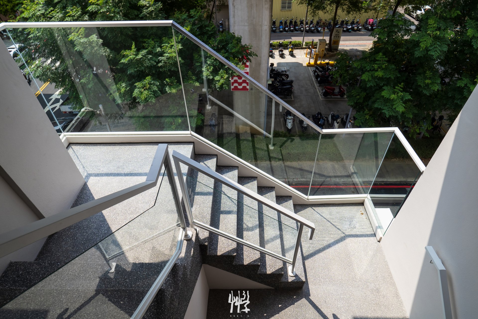 樓梯對外的起點設於二樓,視線越過街道,與車站下方的公共綠化相互對望,成為進入垂直動線的第一個節點。由三樓向四樓攀升的過程中,樓梯緊貼建築外側,視角沿著軌道結構自下而上展開,目光隨列車行進方向延伸至遠方。行至四樓與五樓的迴轉平台,視野再次被打開,得以直接眺望月台,視線的空間關係在駐足停頓時拉近,實際的空間關係又隨著上行或下行而有所變化。